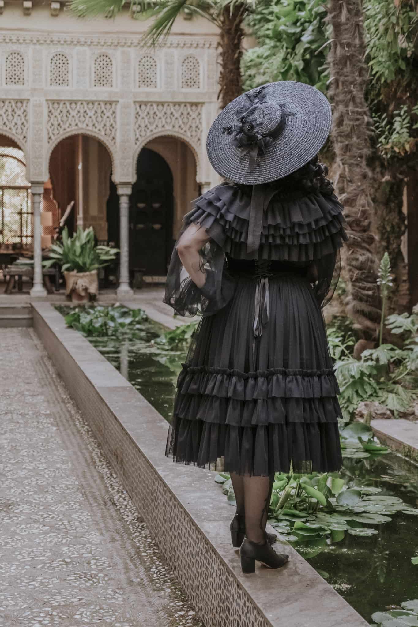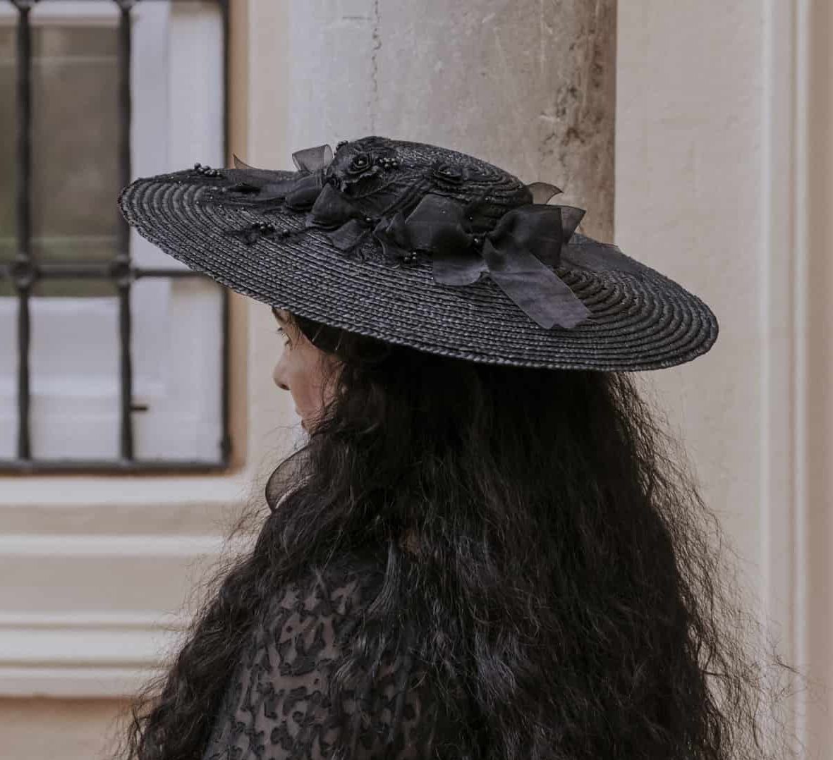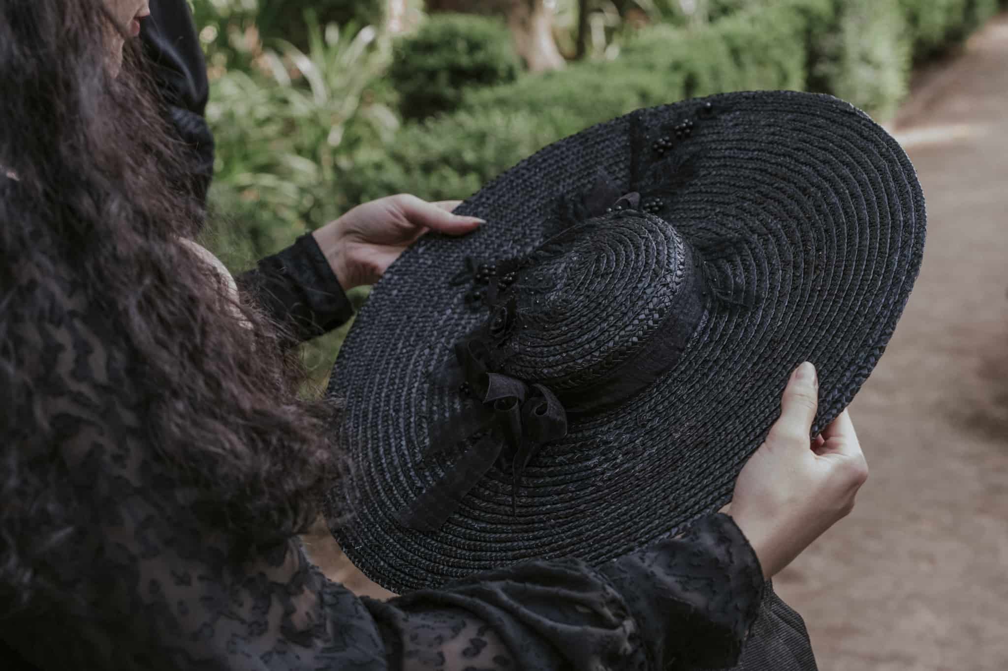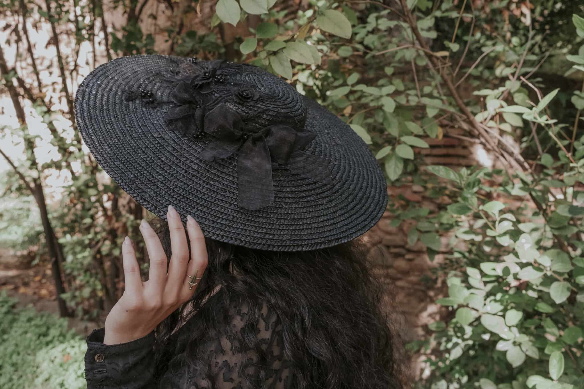 It is a pamela decorated with lace, organza and mourning gemstones. It is perfect for the most elegant occasions and the most glamorous looks.